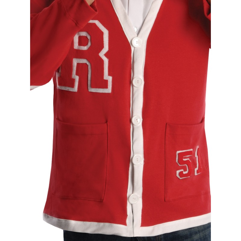 - Red polyester button up jacket with attached shirt and printed R plus attached pockets