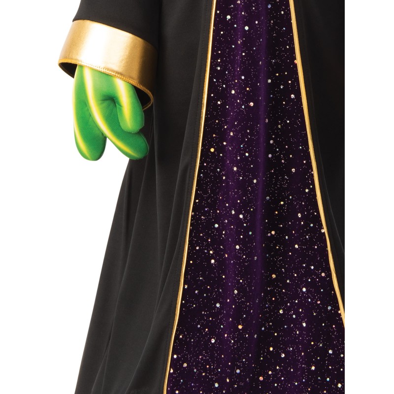 - Full length hooded robe in polyester fabric with gold details at hood, collar and centre panel plus glittery stars in purple panel from chest to ground