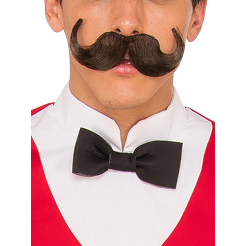 - Faux moustache made from polypropylene hair strands and face friendly glue to attach plus cleaning cloth to hang from pants