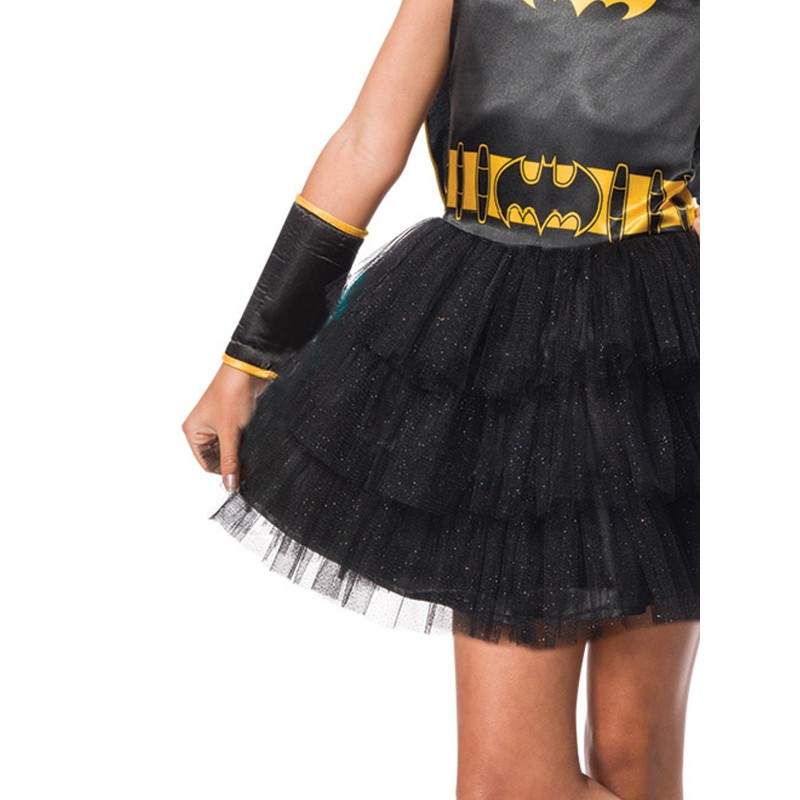 - Dress with digitally printed satin bodice showing bat emblem on chest and belt details at waist, plus ruffle tutu skirt with nylon underlay and three layers of glitter tulle ruffles