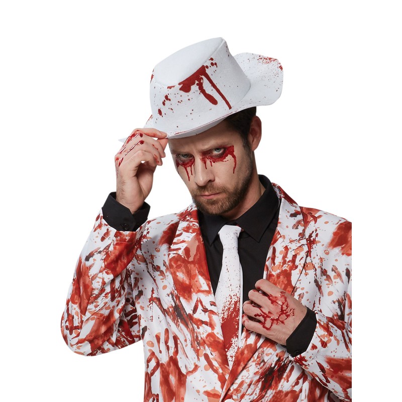 - Hat is white bowler style with faux blood splatter