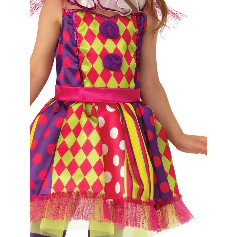 - Dress with colourful printed panels in satin and glittery tulle hem plus two pompoms attached. Dress has pink satin belt band and yellow underlay plus glittery tulle at shoulders