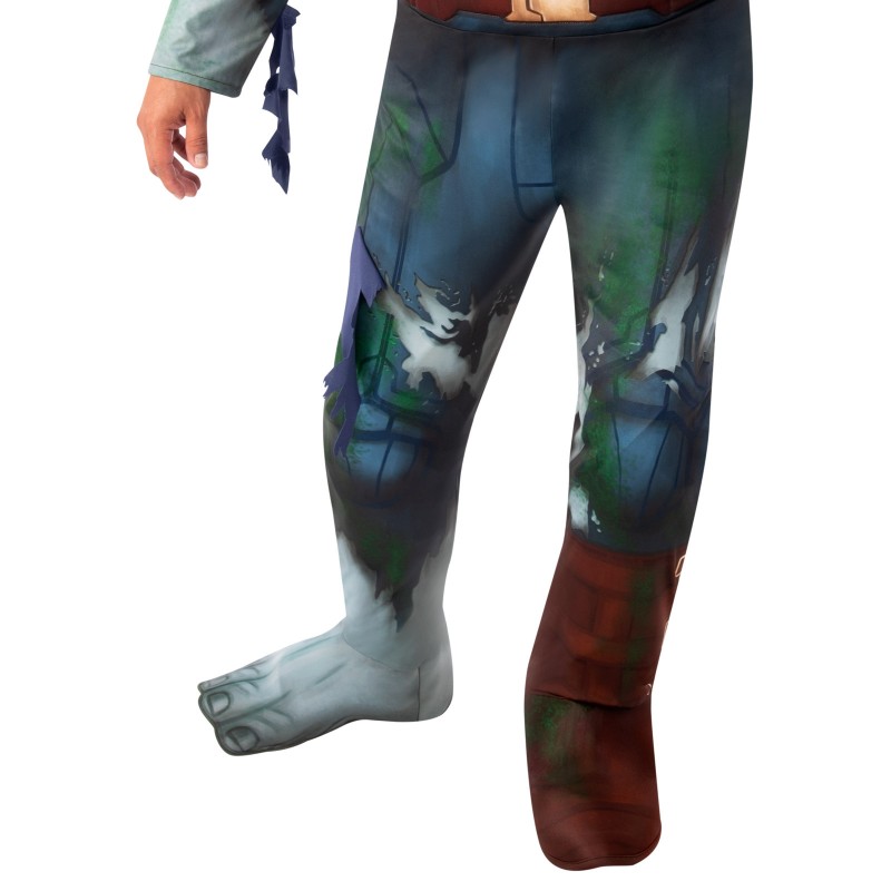 - Jumpsuit with digitally printed bodice and sleeves, foam filled padding with stitching detail and attached shoulder straps. Costume is zombie-like with torn and ripped elements and green slime printed all over it