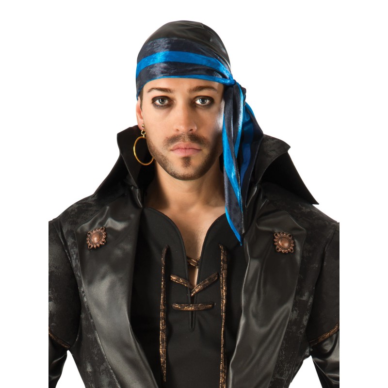 - Long faux leather jacket with attached suede look panels and attached gold painted skull and cross bones cuff links plus attached shirt front with lace ties