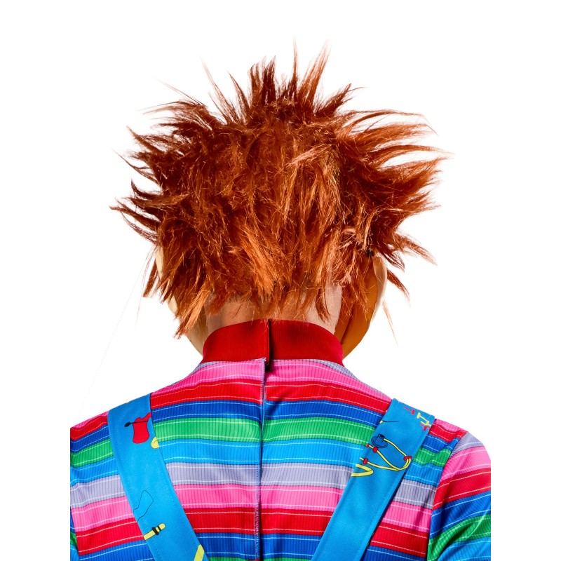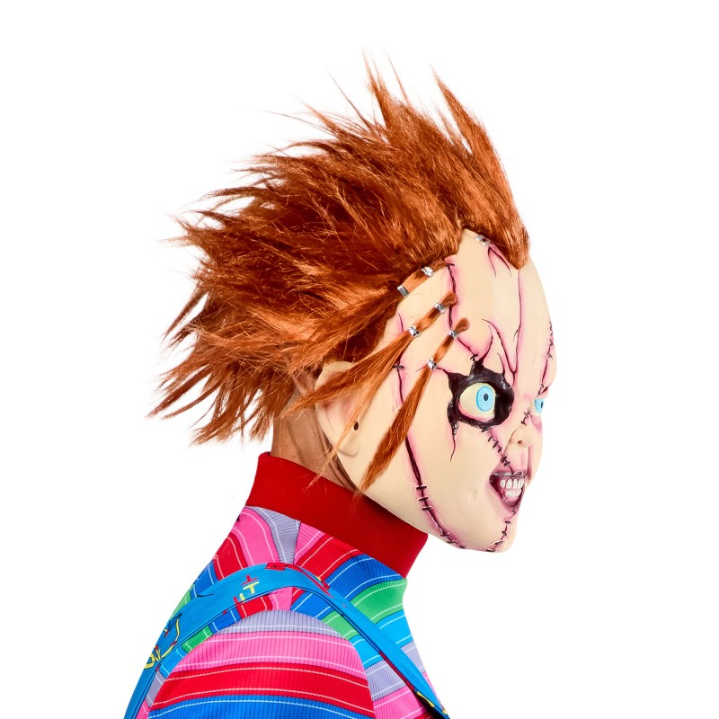 - Overhead mask of character Chucky, complete with painted stitches and cuts across the face