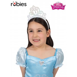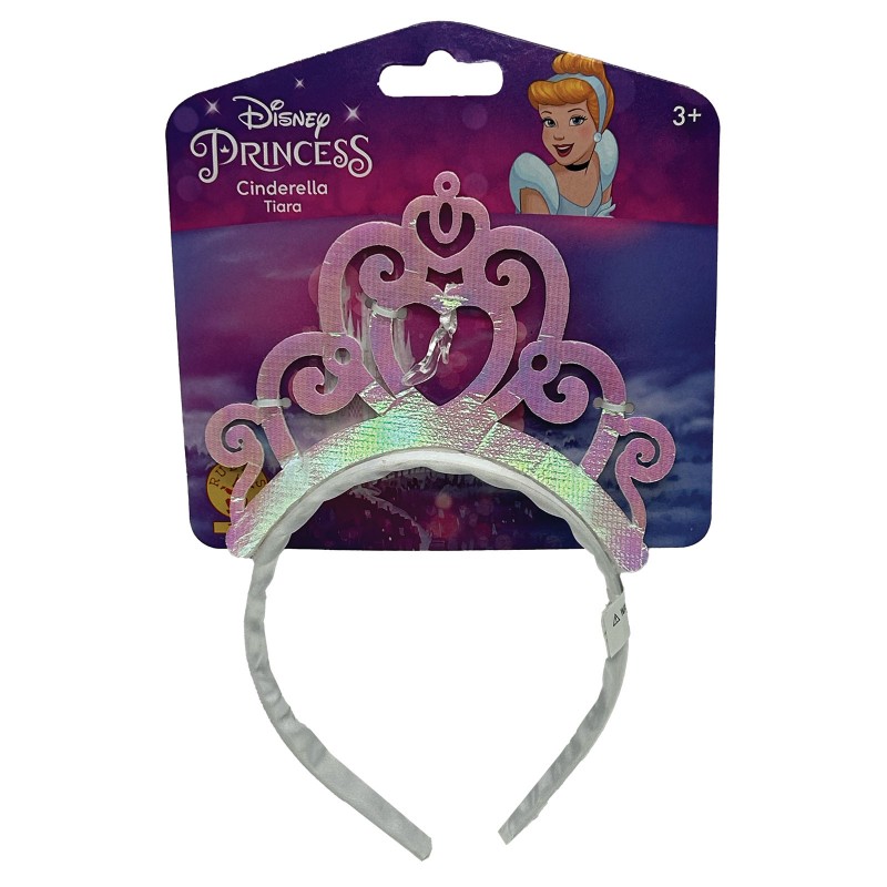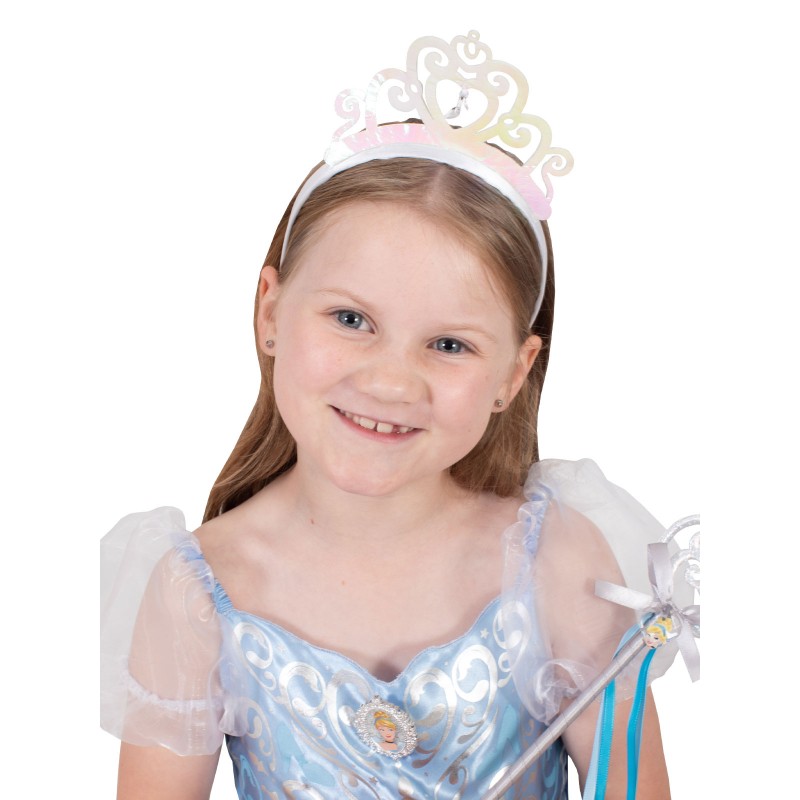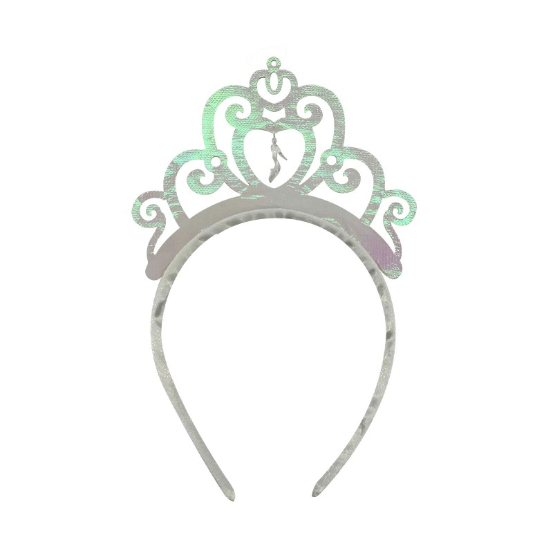 - Tiara is on a plastic headband and covered with patterned fabric in white
