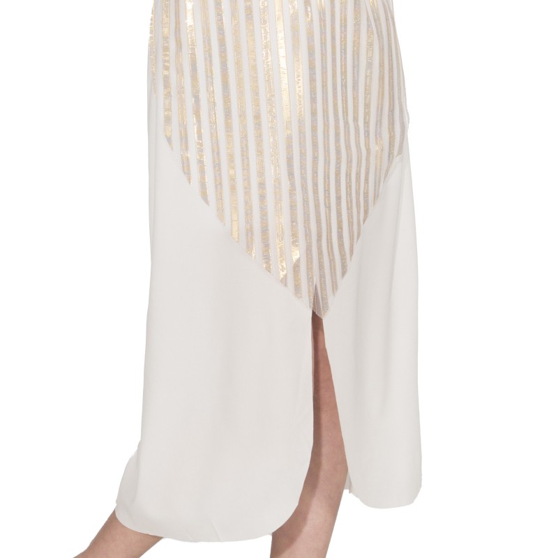 - Dress with gold highlights abnd small slit at front of skirt