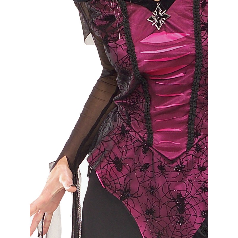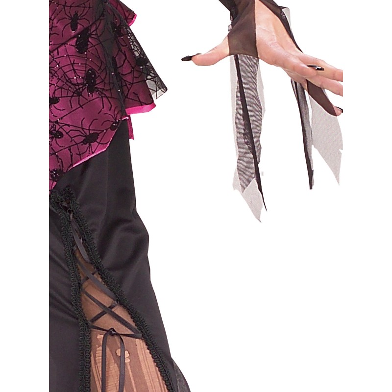 - Long tattered and torn dress with satin fitted bodice featuring lace and spiders in webs and wide off the shoulder stand up collar