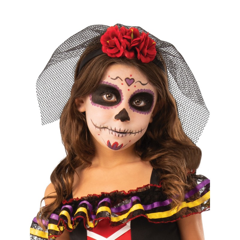 - Headpiece is a headband with red fabric roses and lacy tulle veil at the rear