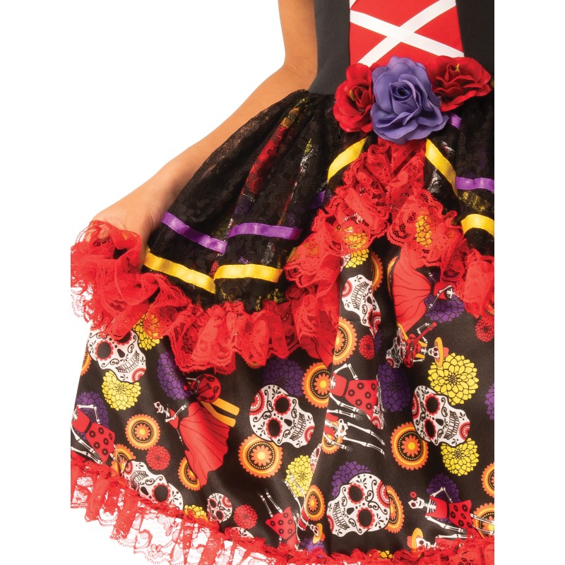 - Dress has lacy trim and attached fabric roses at bodice plus criss cross design at the front