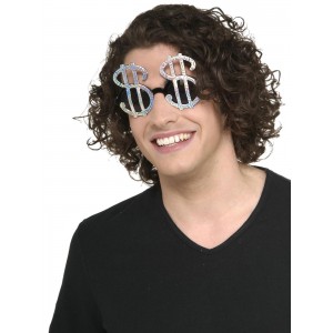 - Glasses feature dollar signs in front of the lenses made from painted silver plastic with rainbow texture in the light