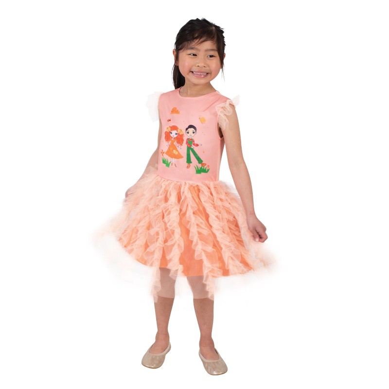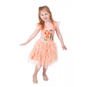 - Deluxe tutu dress in peachy-orange tones with a digitally printed graphic of Emma Memma and Elvin Melvin dancing on the bodice and tulle tufts on shoulders