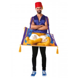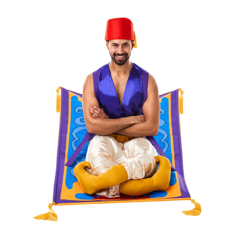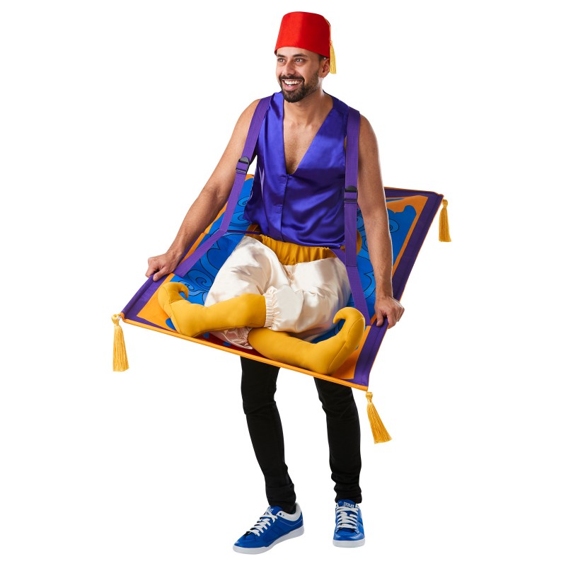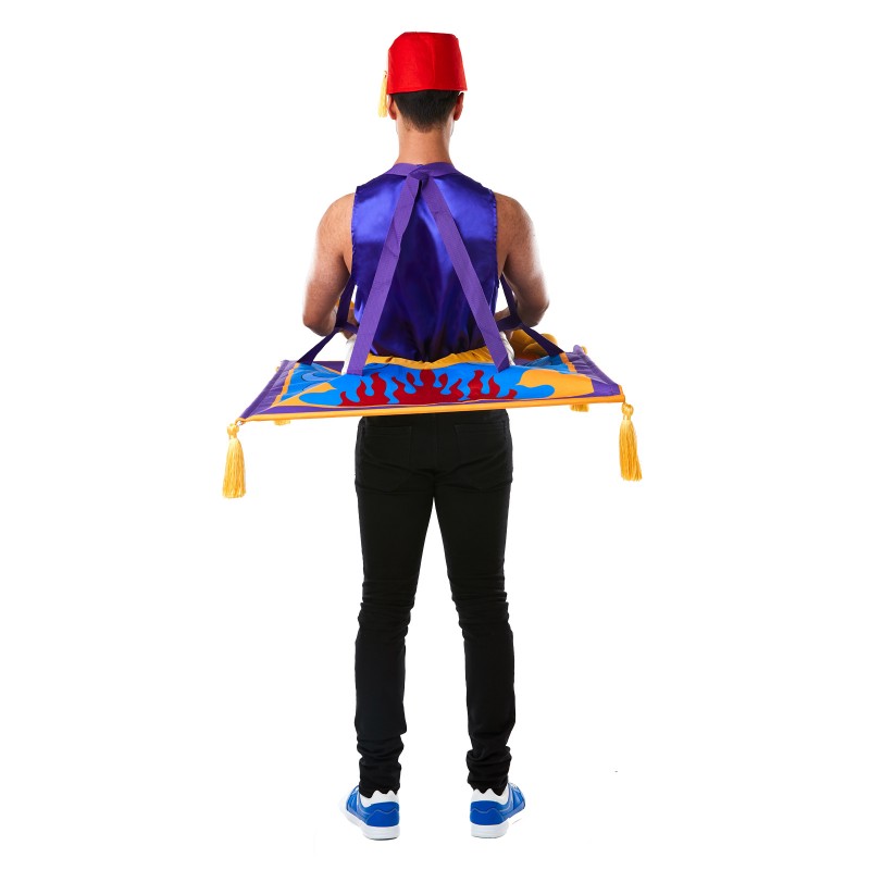 - Colourful flying carpet square with tassles on the corners and centre insert for wearer to step into, surrounded by broad elastic waistband
