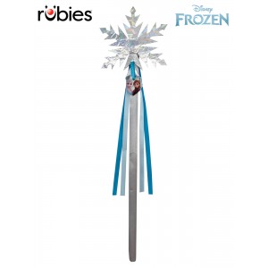 - Plastic wand with shimmery snowflake in silver tones at the top and a handle wrapped in silver satin fabric
