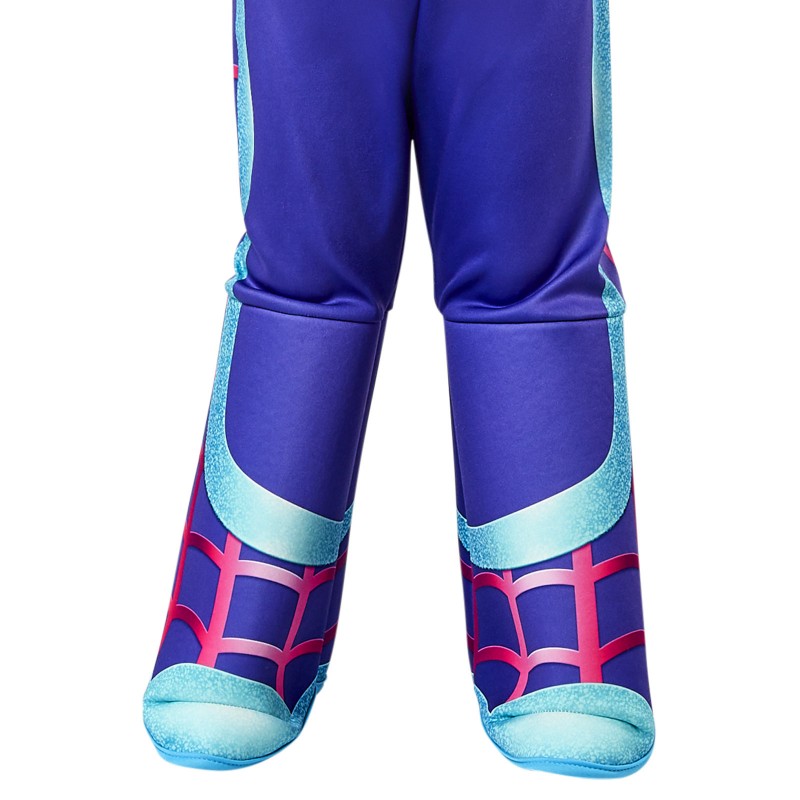- Jumpsuit has blue glitter highlights as a feature and is in Ghost Spider's colourways of white, purple, pink and blue
