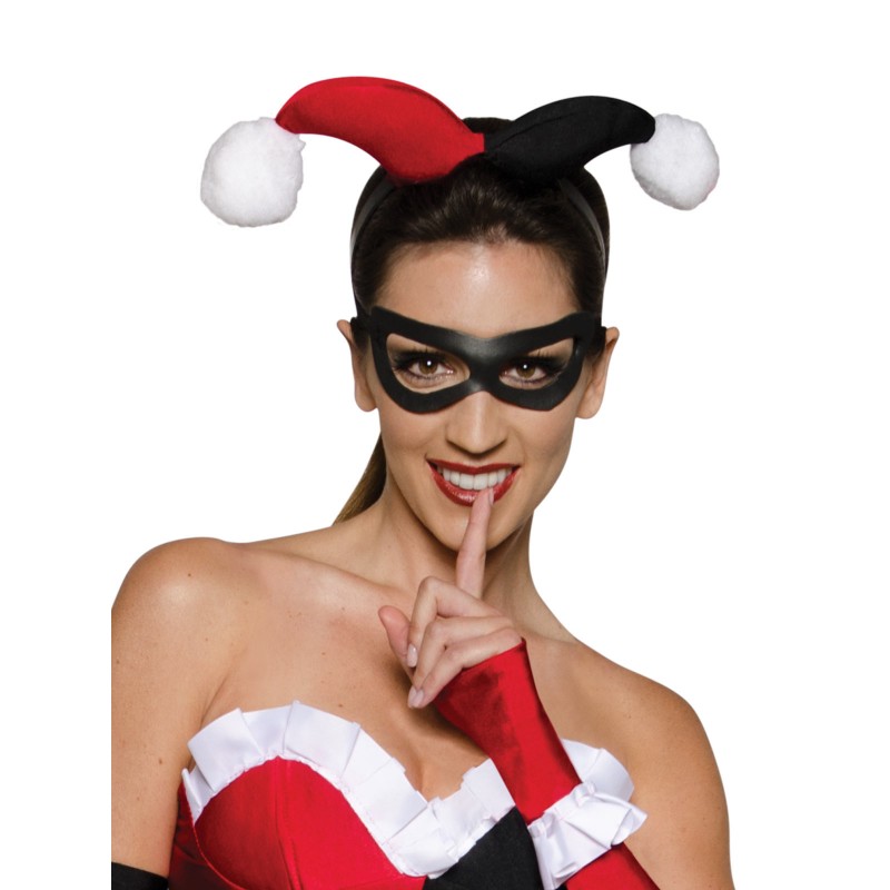 - Shaped eye mask with elastic strap plus headband with fools hat feature and attached pompoms
