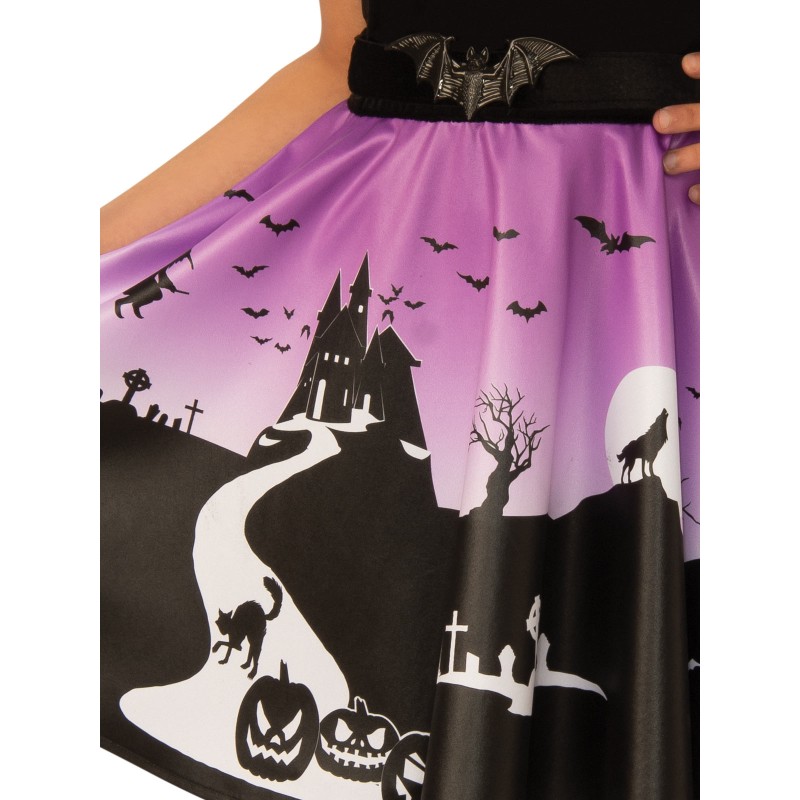 - Sleeveless dress with satin skirt and polyester bodice featuring digitally printed halloween design in gradient purple tones