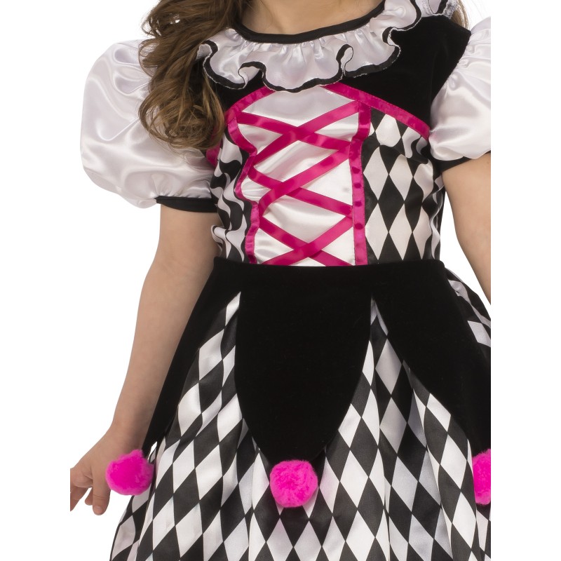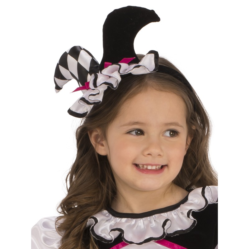 - Headband with 'Fool's Hat' on top and satin ruffle with black trim plus pink bow decorations