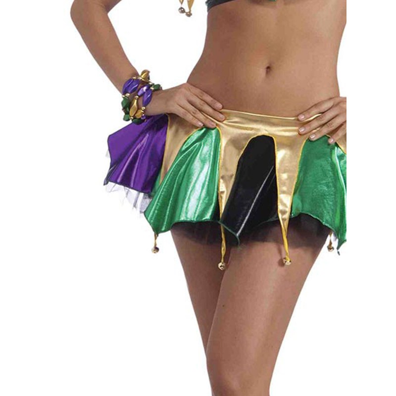 - Matching mini skirt with layered segments and small gold painted bells at pointed ends