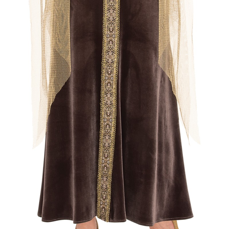 - Ornate embellished panels at neckline and down centre of dress with gold braid trim