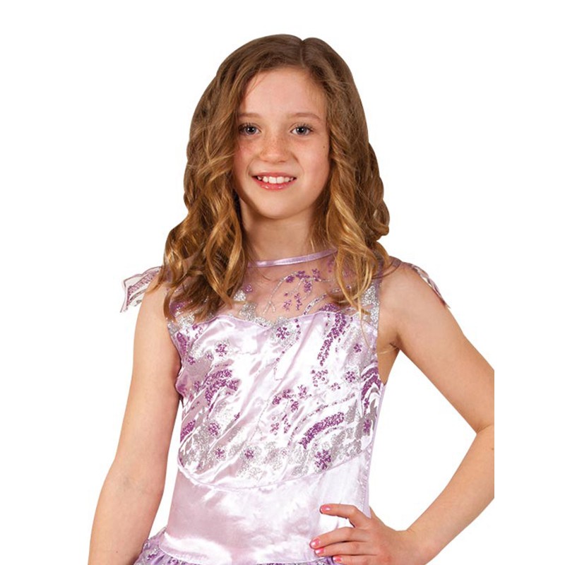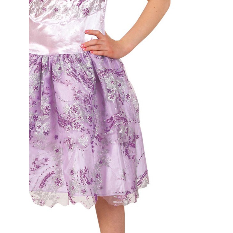 - Satin and organza dress with tulle underlay on skirt and delicate silver and purple glitter design on skirt and torso