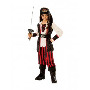 - Belt with plastic skull buckle and polyester bandana with pirate emblem on front. Sword sold separately