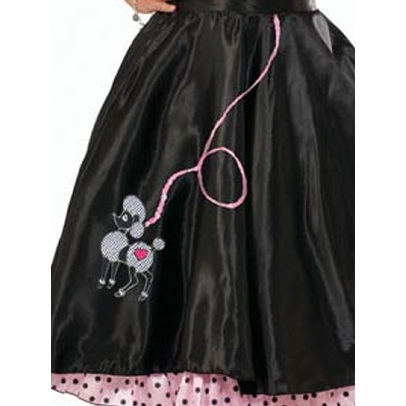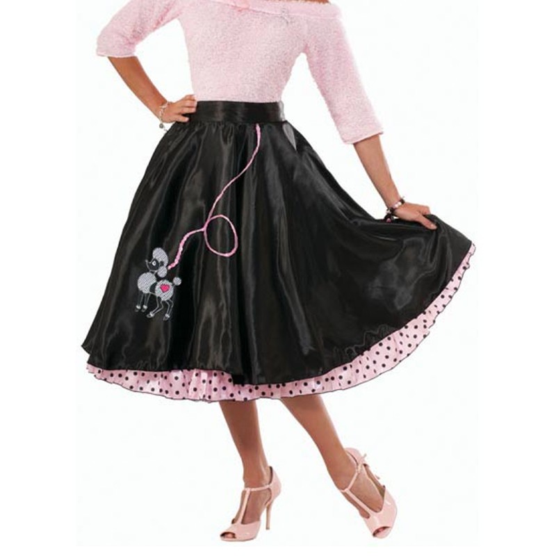 - Full black flowing skirt in satin with wide waistband and pink satin underlay with black polka dots