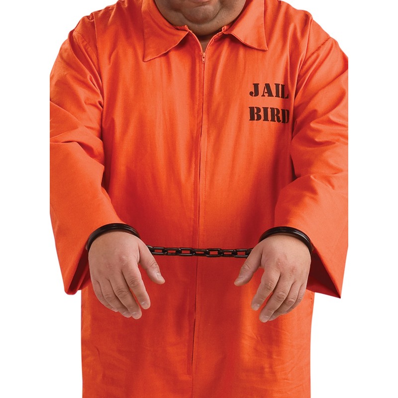- Orange all-in-one jumpsuit with printed words JAIL BIRD on left chest