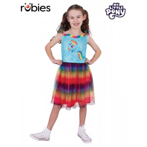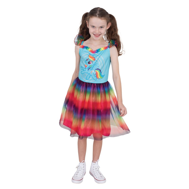 - Colourful dress with tulle layered tutu skirt featuring rainbow coloured satin and tulle overlay
