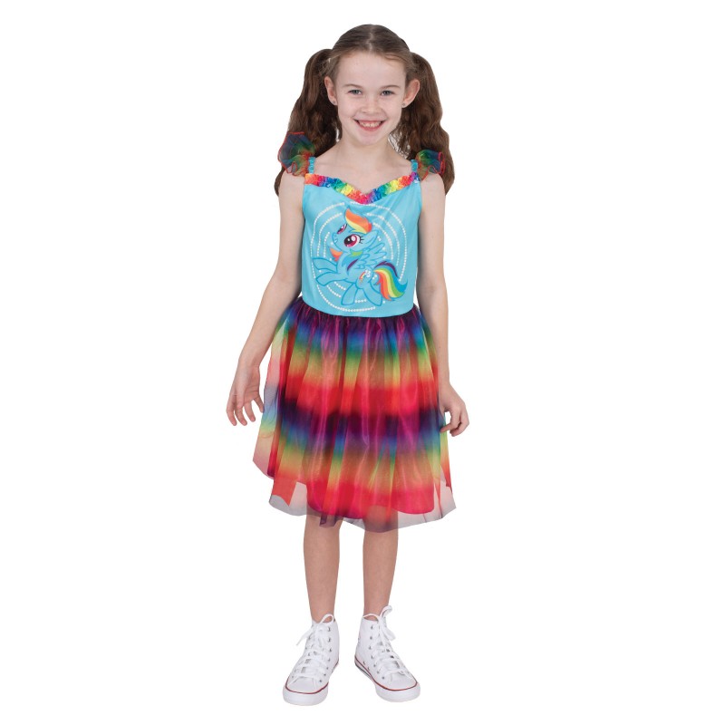 - Bodice featuring large character motif, taffeta ruffled shoulder straps and rainbow neckline with ruffles