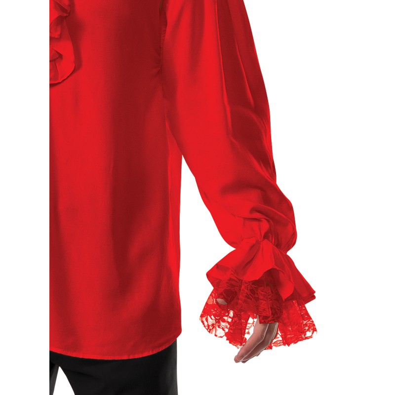 - Long red pirate style shirt with lace up front and feature ruffle at chest