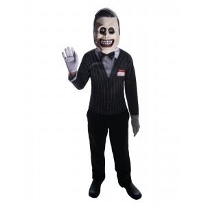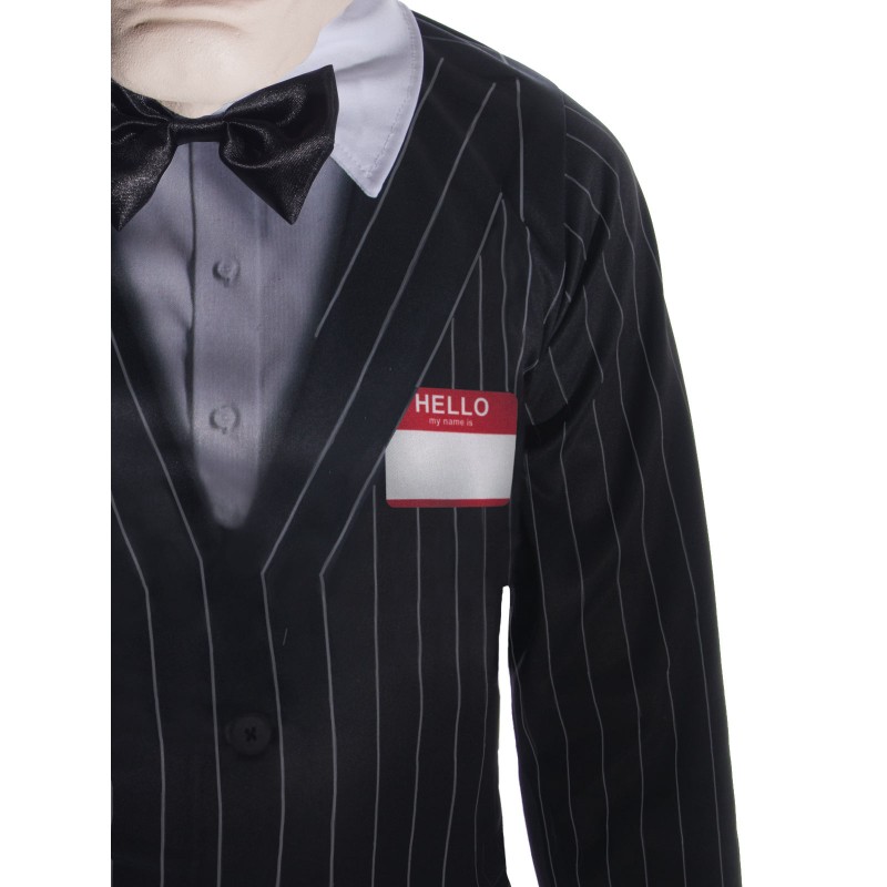 - Pinstripe Jacket with mock shirt, collar and bow tie attached and name tag printed on to jacket