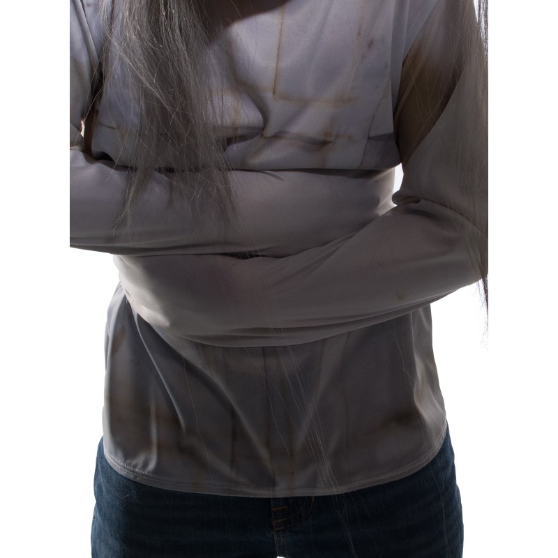 - White polyester top designed to be like a straight jacket with soft digital print