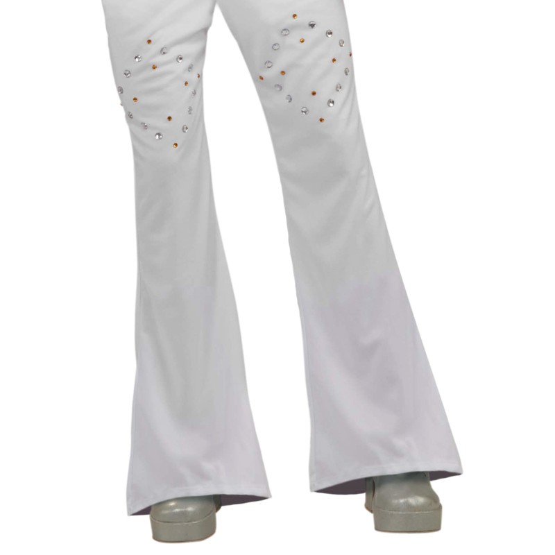 - Iconic white full body jumpsuit with printed glittery jewels on bodice and sleeves, plus stand-up high collar. Front zipper closure