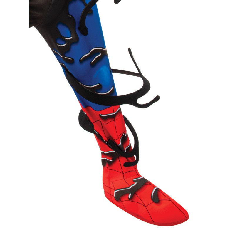 - Digitally printed jumpsuit with new wet-look material and fibre filled muscle chest and stitching. Jumpsuit is half Venom in black and half Spider-Man in blue and red and features attached boot covers
