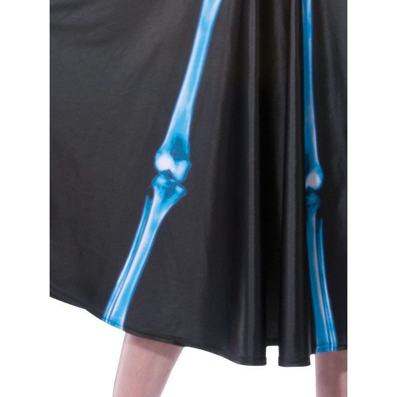 - Dress with digitally printed skeleton featuring glow in the dark elements on chest and legs and elastic at waist. Print is only on the front of the dress