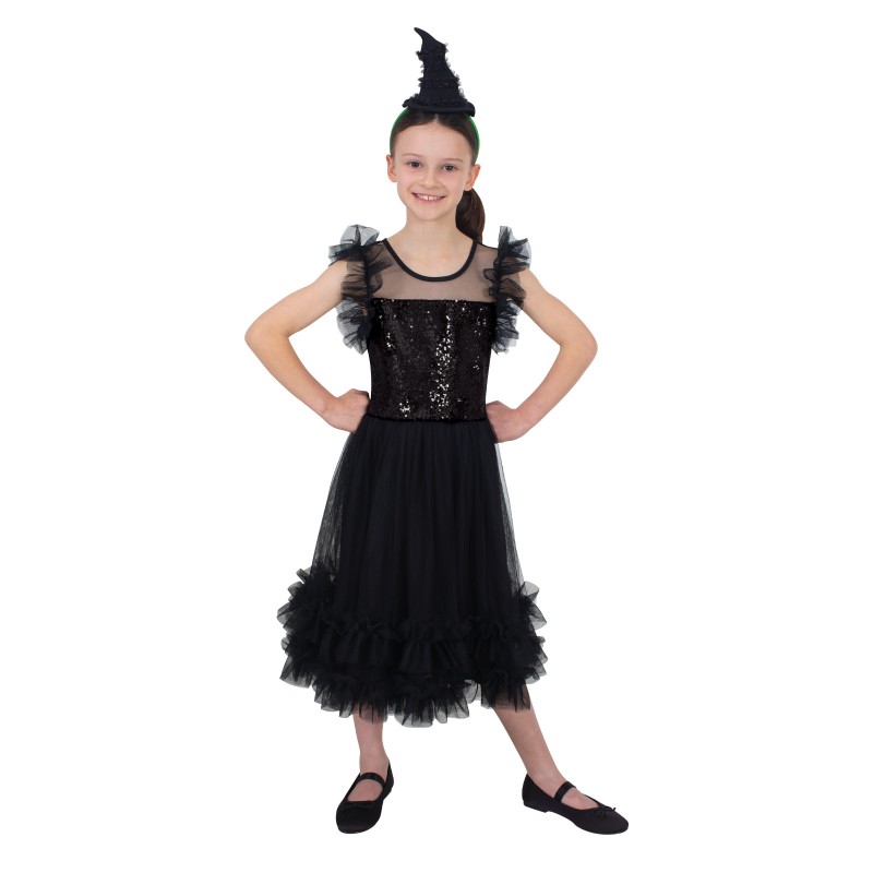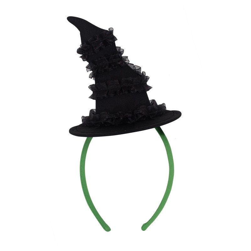 - Green headband with a fibre filled witch's hat with bent tip and frilly layers